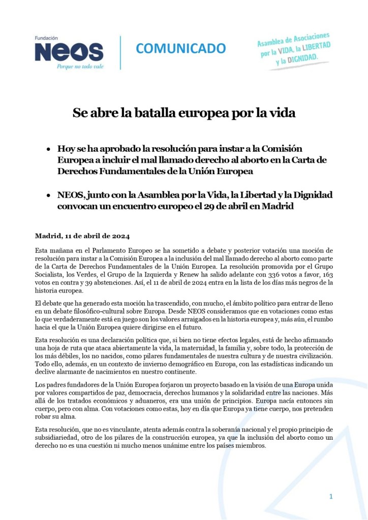 Desde la Asamblea por la Vida, la Dignidad y la Libertad recordamos que el derecho internacional sigue siendo claro y consistente: todas las personas tienen derecho a la vida, independientemente de su edad, sexo, capacidad, origen o etapa de desarrollo. La resolución llega incluso a denunciar a médicos en Italia, Eslovaquia y Rumania que se oponen a realizar abortos, en clara violación de su derecho a la libertad de conciencia y en ignorancia deliberada de su juicio médico investigado.
