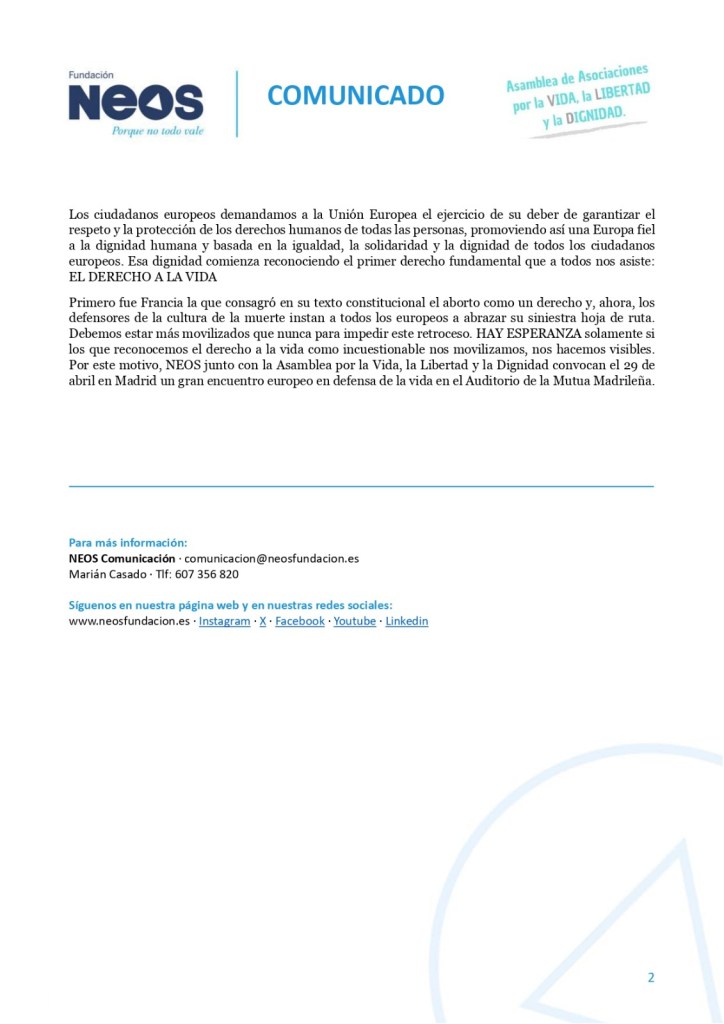 Frente al avance en defensa de la vida que se quiere imponer en Europa, queremos invitar a todos los ciudadanos que defienden la libertad, la familia y la vida a seguir en esa batalla, una batalla que merece la pena y en la cual el sentido común se impondrá.