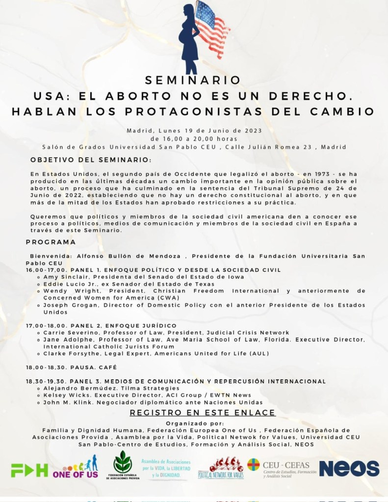 Para dar a conocer a los políticos de todos los partidos, a la sociedad civil y a los medios españoles este heroico proceso de reversión en Estados Unidos de la regulación del aborto, varias entidades de la sociedad civil –Familia y Dignidad Humana, CEU-CEFAS, Federación Europea One of Us, Federación Española de Asociaciones Provida, Asamblea de Asociaciones por la Vida, la Libertad y la Dignidad, Political Network for Values y NEOS– han unido sus fuerzas para celebrar el 19 de junio el seminario «USA: el aborto no es un derecho. Hablan los protagonistas del cambio». Allí podrán escuchar a políticos, miembros de la sociedad civil y de los medios americanos explicarnos como lucharon y triunfaron en la defensa de la vida.